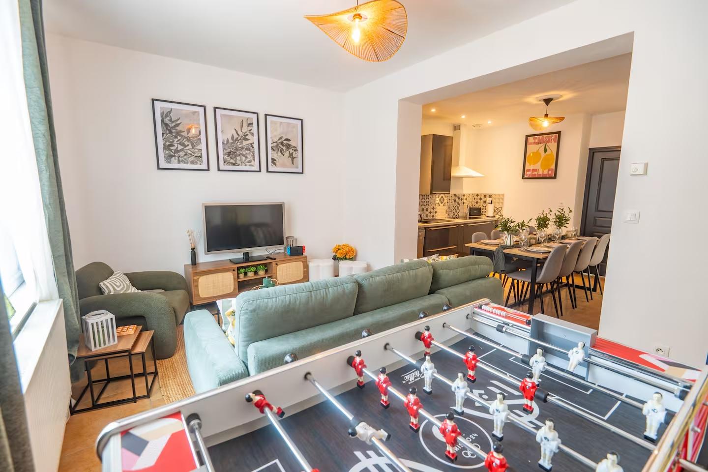 Un espace cosy vous attend avec un canapé confortable, parfait pour vous détendre après une journée de visites. Une grande télévision écran plat est à votre disposition pour vos soirées films ou séries. Pour encore plus de divertissement, vous trouverez un baby-foot et une console Nintendo Switch équipée de jeux tels que Mario Kart et Among Us, adaptée aux petits comme aux grands. Si vous souhaitez, vous pouvez également apporter vos propres jeux Nintendo Switch. L’ambiance lumineuse et la décoration moderne complètent ce charmant espace de vie.